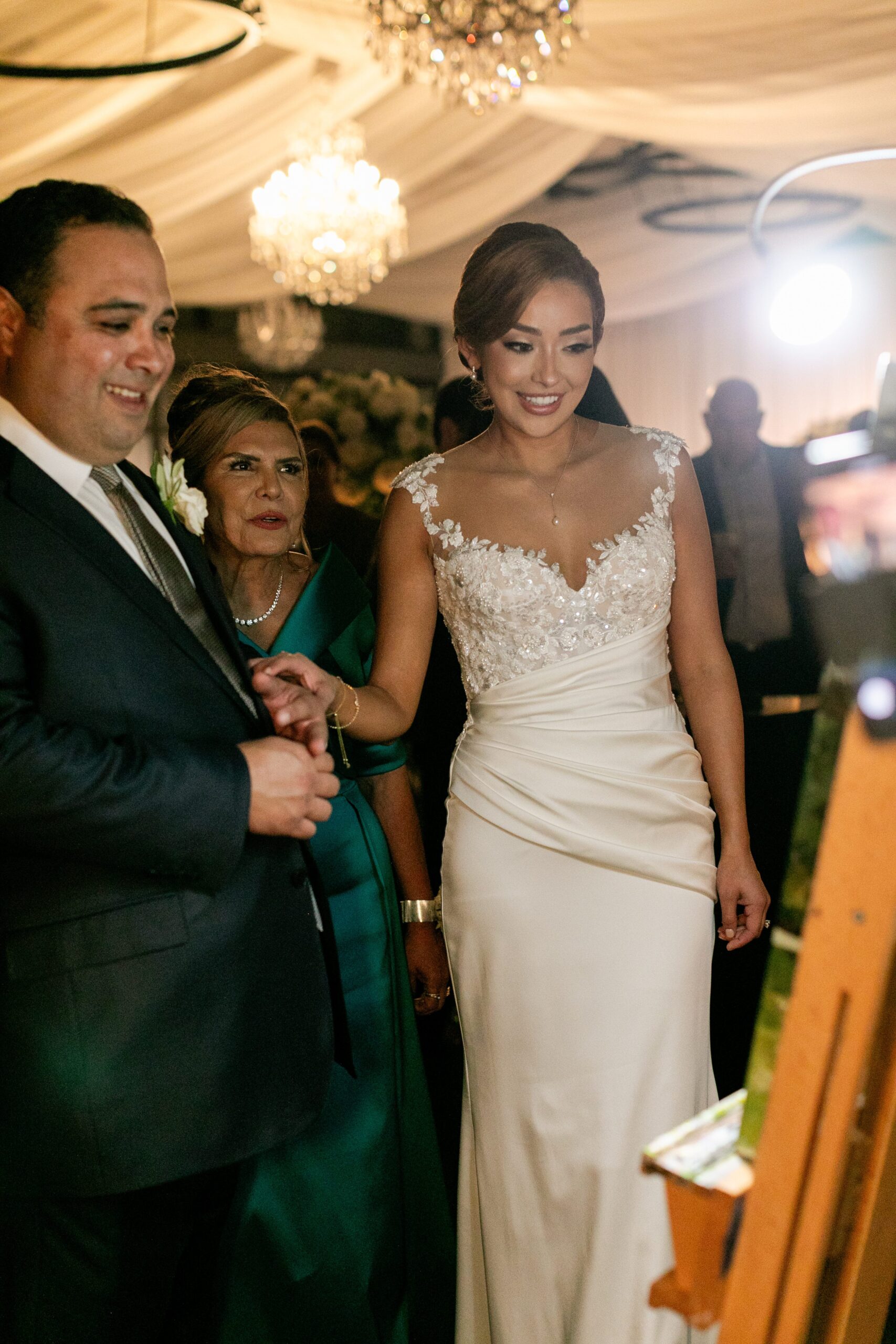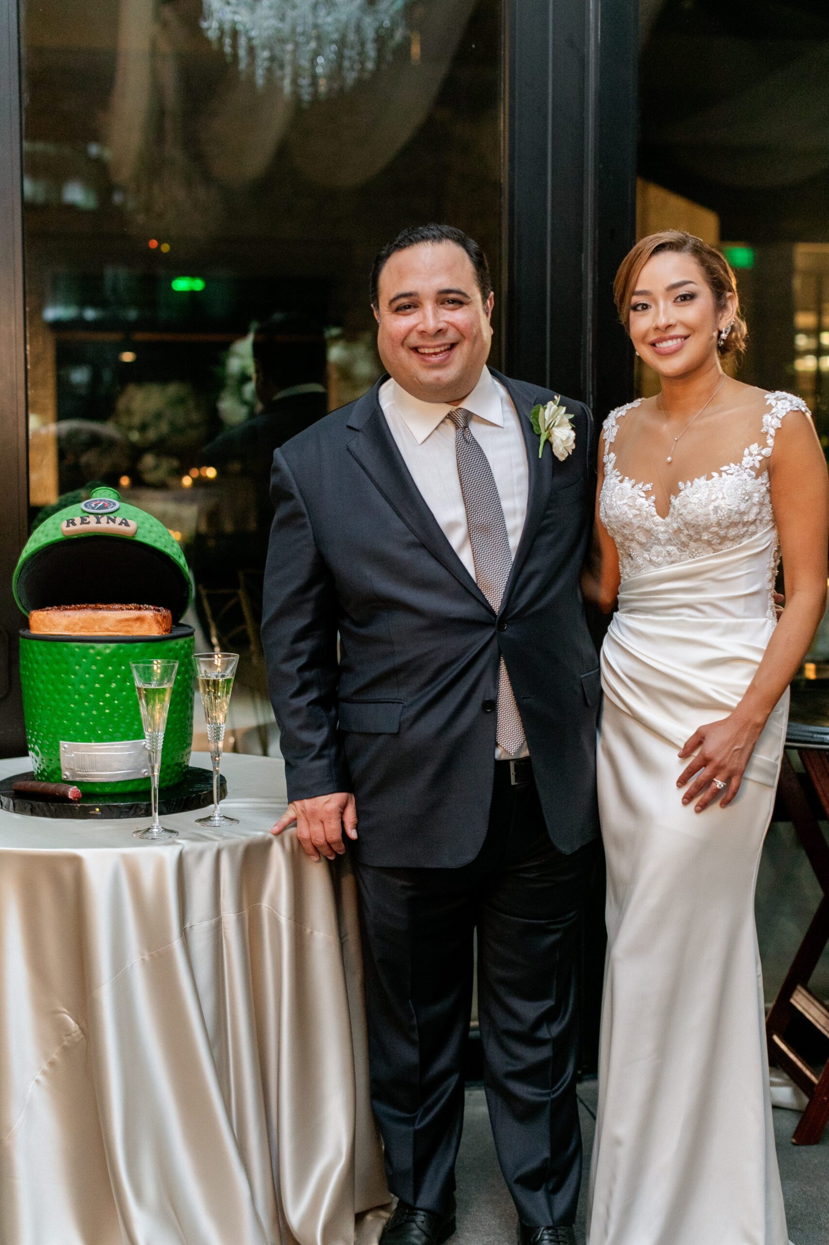 And as for her wedding gown, she wanted a fairytale ball gown that was also form fitting, so she had a custom overskirt made to wear for the ceremony. She worked very closely with the team at Sposa Mia, a coutoure bridal shop in McAllen, and the designer to make her dream dress and veil.