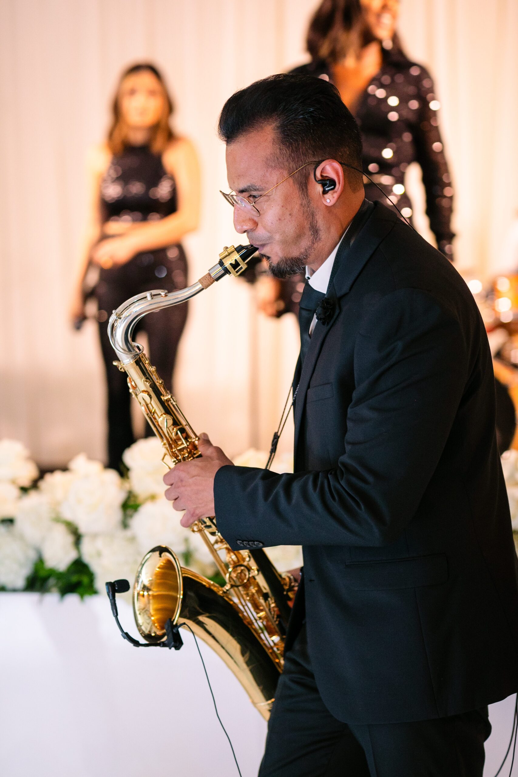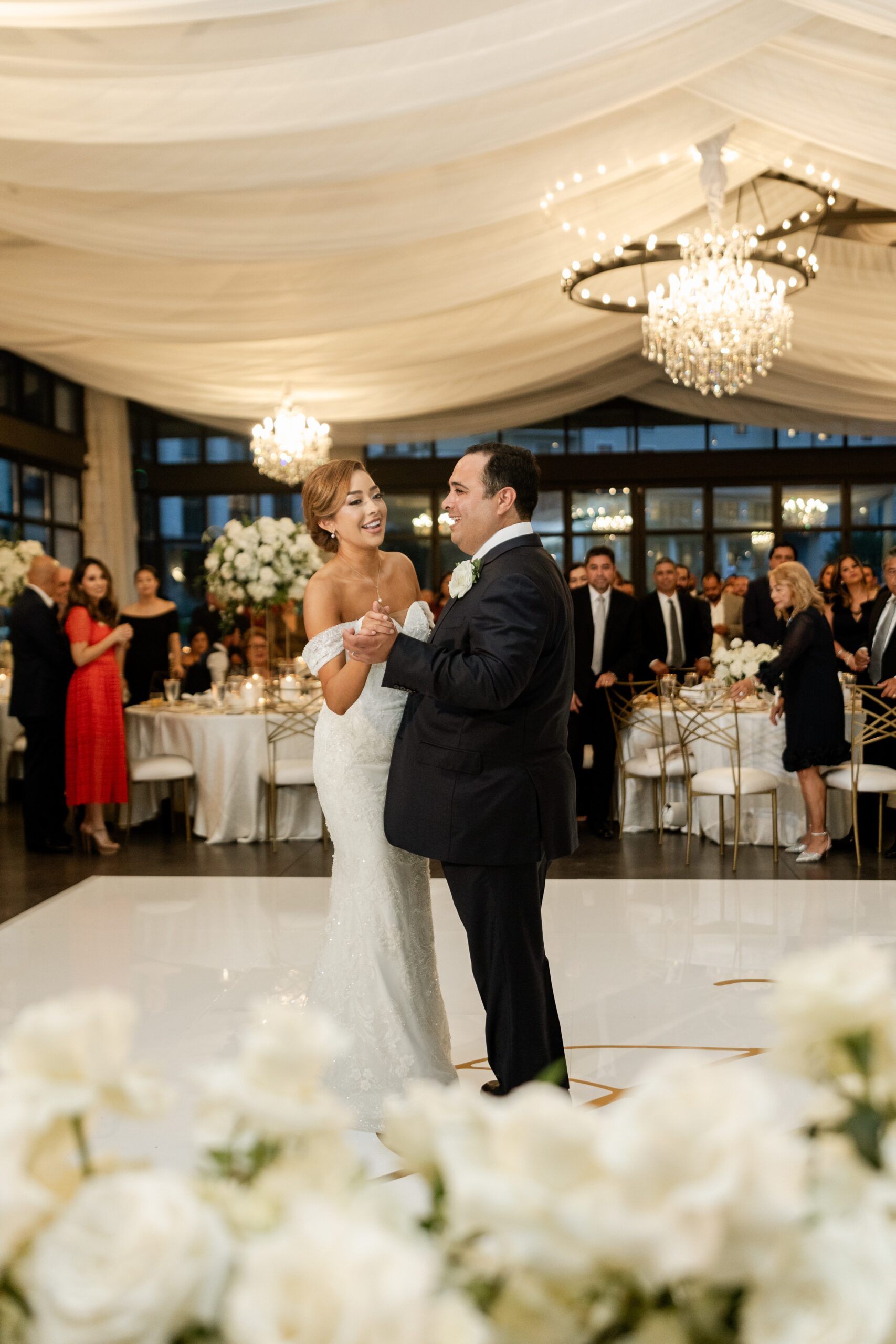 Suzette is a traditional person and knew she wanted white as the base color for all of the florals. She also has a glamorous and chic side she wanted to express, which led her to choose gold accents with candles in the decor to make the room feel warm, romantic, and elegant.